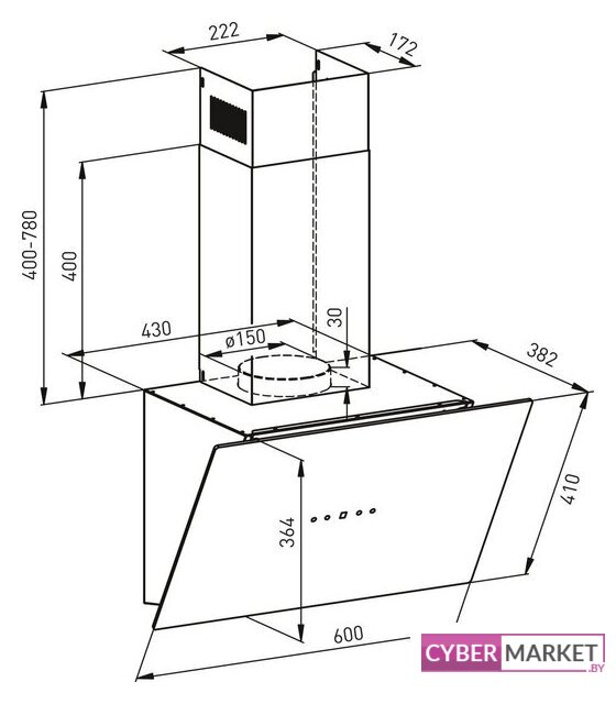 конструкция наклонная, монтаж настенный, ширина 60 см, управление сенсорное, производительность мотора 850 м³/ч, цвет черный