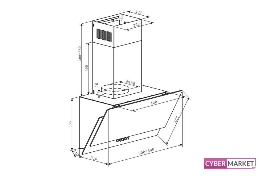 конструкция купольная, монтаж настенный, управление кнопочное, производительность мотора 650 м³/ч, ширина 59 см