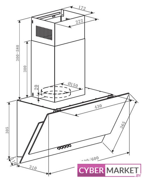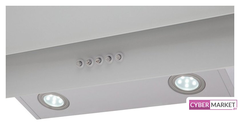 конструкция скрытая, монтаж настенный, ширина 55 см, управление электронное/кнопочное, производительность мотора 900 м³/ч, цвет белый
