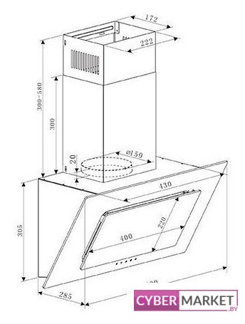 конструкция купольная, монтаж настенный, управление механическое/кнопочное, производительность мотора 430 м³/ч, ширина 50 см