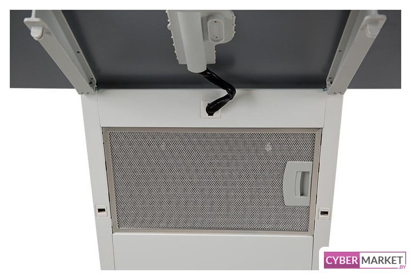 конструкция скрытая, монтаж для встраивания, ширина 59.8 см, управление механическое/кнопочное, производительность мотора 1050 м³/ч, цвет белый