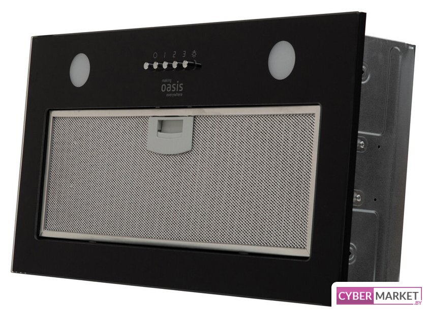 конструкция наклонная, монтаж настенный, ширина 59 см, управление механическое/кнопочное, производительность мотора 430 м³/ч, цвет черный