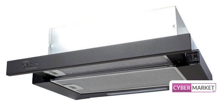 конструкция скрытая, монтаж для встраивания, ширина 52 см, управление механическое/кнопочное, производительность мотора 750 м³/ч, цвет черный