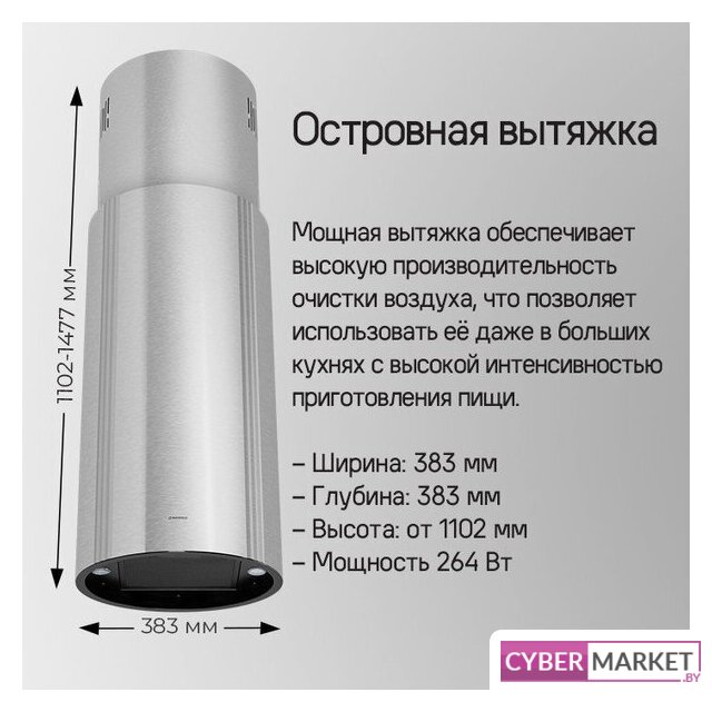 конструкция коробчатая, монтаж островной, ширина 40 см, управление электронное/кнопочное, производительность мотора 1150 м³/ч, цвет черный
