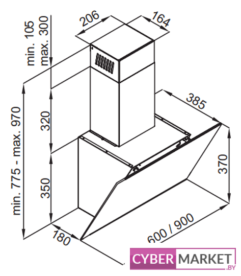 конструкция Т-образная, монтаж настенный, управление электронное/сенсорное, производительность мотора 600 м³/ч, ширина 89.8 см