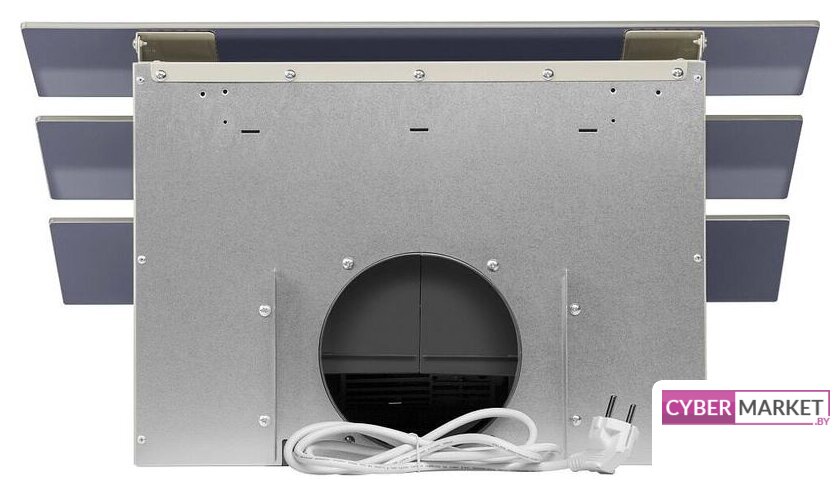 конструкция Т-образная, монтаж настенный, ширина 90 см, управление механическое/кнопочное, производительность мотора 850 м³/ч, цвет черный