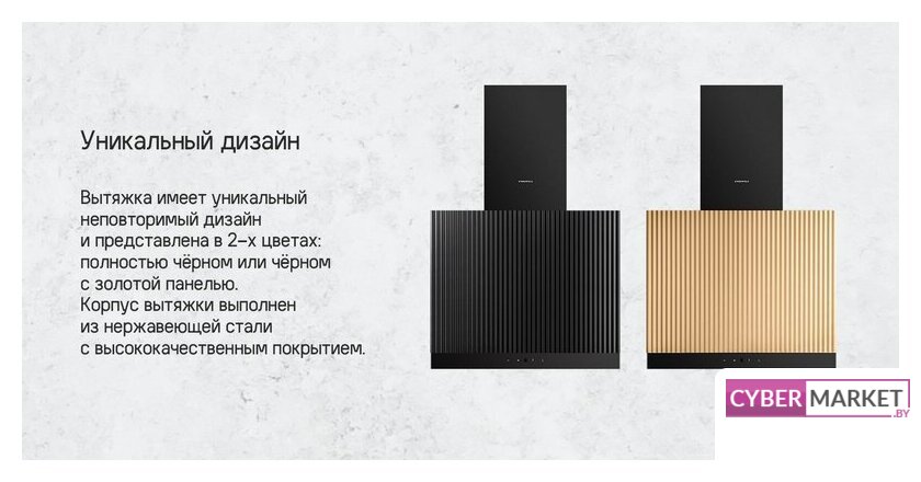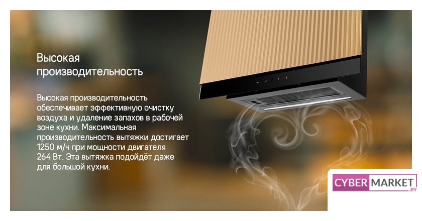 конструкция коробчатая, монтаж островной, ширина 38 см, управление электронное/кнопочное, производительность мотора 1000 м³/ч, цвет золотой