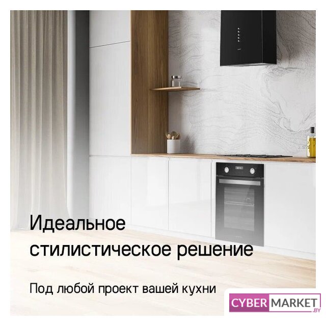 конструкция Т-образная, монтаж настенный, ширина 60 см, управление сенсорное, производительность вытяжки 950 м³/ч, цвет нержавеющая сталь/черный