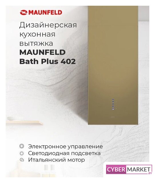 конструкция коробчатая, монтаж островной, ширина 38.3 см, управление механическое/кнопочное, производительность мотора 1050 м³/ч, цвет золотой
