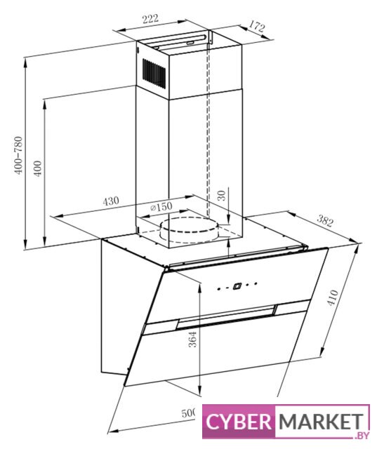 конструкция наклонная, монтаж настенный, ширина 60 см, управление электронное/кнопочное, производительность вытяжки 550 м³/ч, цвет черный