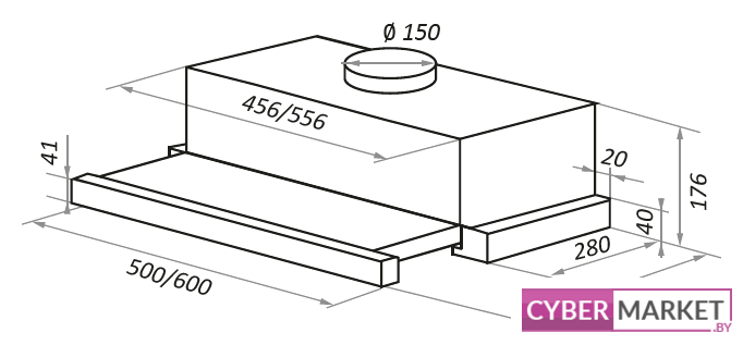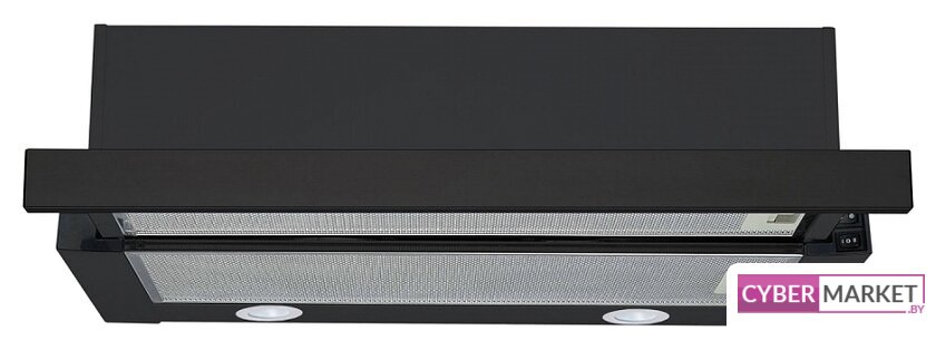 конструкция телескопическая, монтаж для встраивания, ширина 59.5 см, управление механическое/кнопочное, производительность мотора 650 м³/ч, цвет черный
