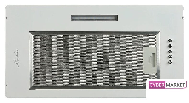 конструкция скрытая, монтаж для встраивания, ширина 52 см, управление механическое/кнопочное, производительность мотора 600 м³/ч, цвет черный