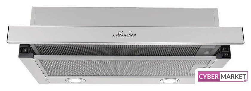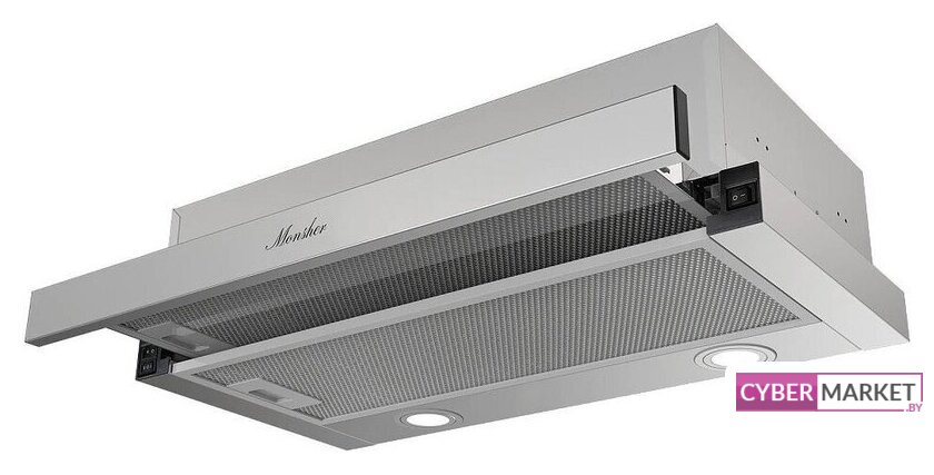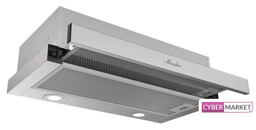 конструкция скрытая, монтаж для встраивания, ширина 59.8 см, управление механическое/кнопочное, производительность мотора 500 м³/ч, цвет хром