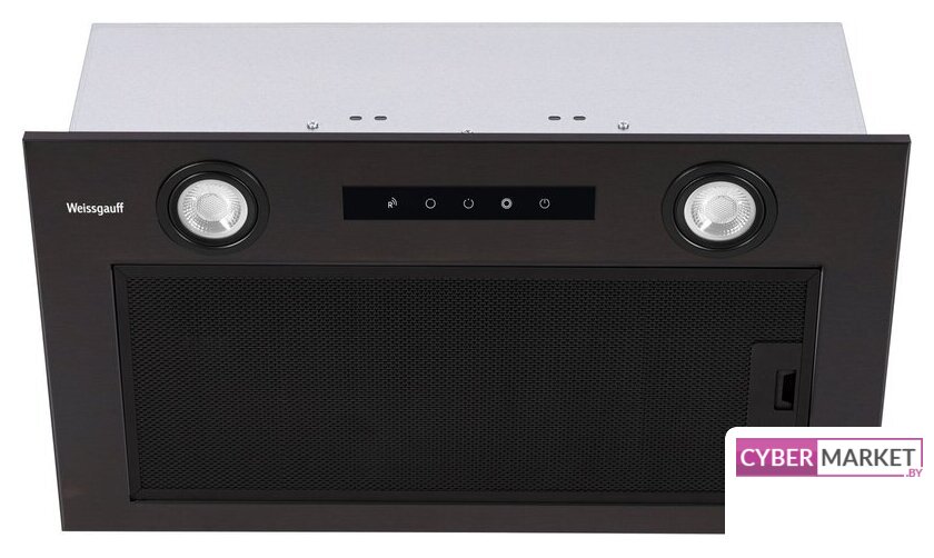 конструкция скрытая, монтаж для встраивания, ширина 53 см, управление механическое/кнопочное, производительность мотора 1100 м³/ч, цвет черный