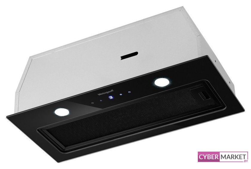 конструкция скрытая, монтаж для встраивания, ширина 53 см, управление механическое/кнопочное, производительность мотора 1100 м³/ч, цвет черный