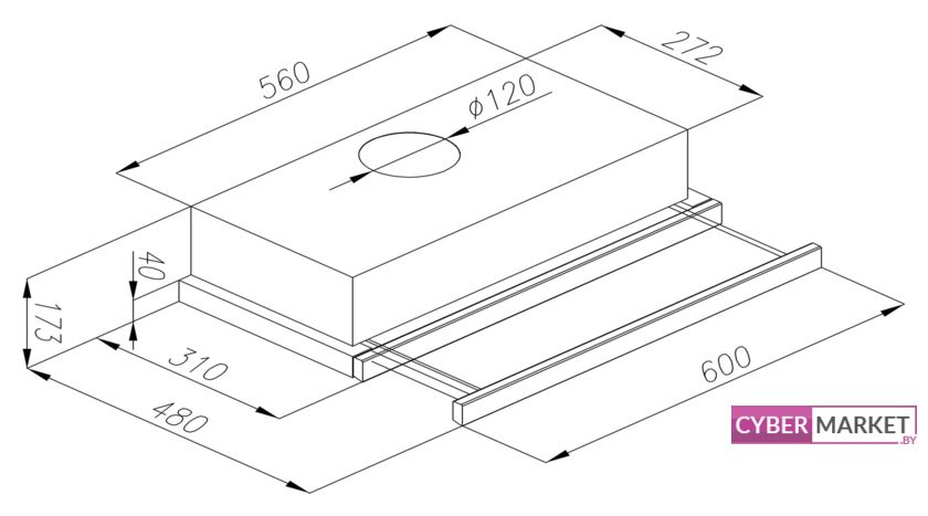 конструкция скрытая, монтаж для встраивания, ширина 52.6 см, управление механическое/кнопочное, производительность мотора 550 м³/ч, цвет черный