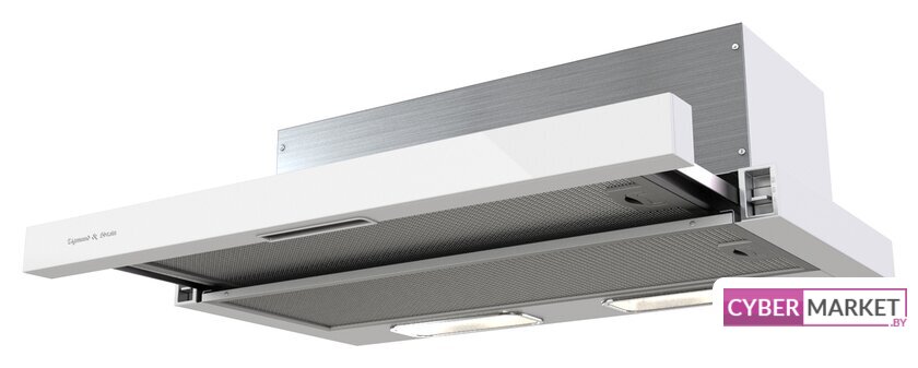 конструкция телескопическая, монтаж для встраивания, ширина 59.8 см, управление механическое/кнопочное, производительность мотора 320 м³/ч, цвет белый