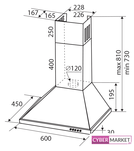 конструкция плоская, монтаж настенный, ширина 60 см, управление механическое/кнопочное, производительность мотора 455 м³/ч, цвет нержавеющая сталь
