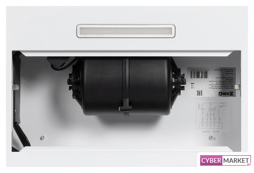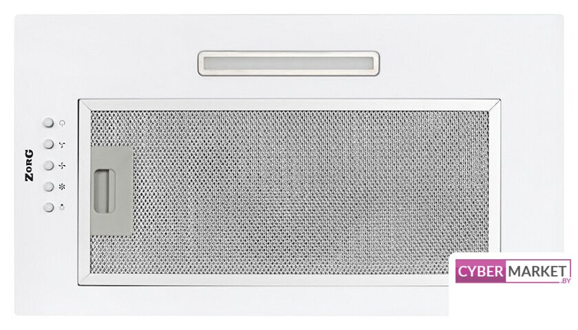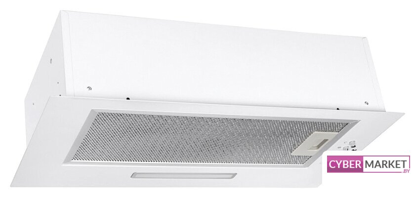 конструкция телескопическая, монтаж для встраивания, ширина 59.5 см, управление механическое/кнопочное, производительность мотора 600 м³/ч, цвет белый/нержавеющая сталь