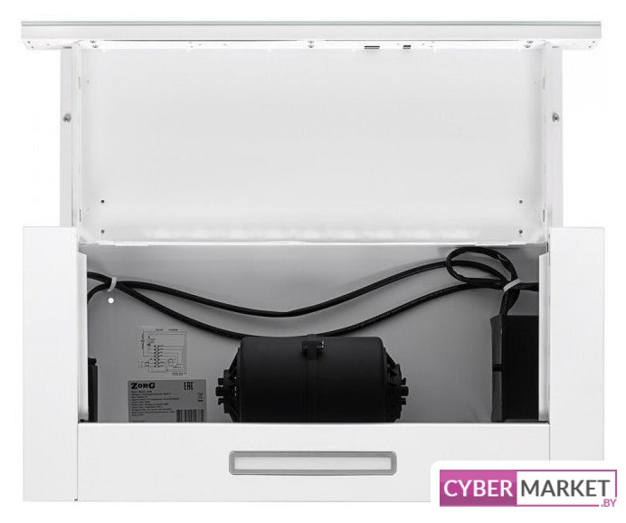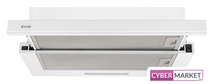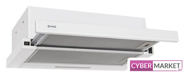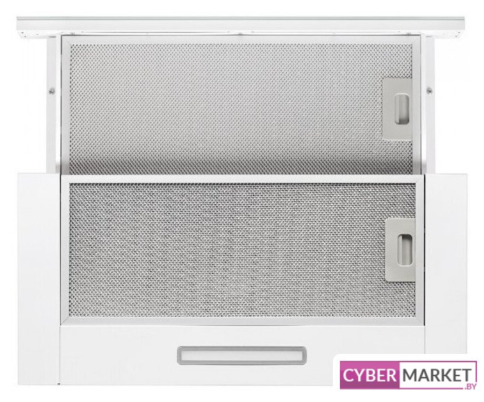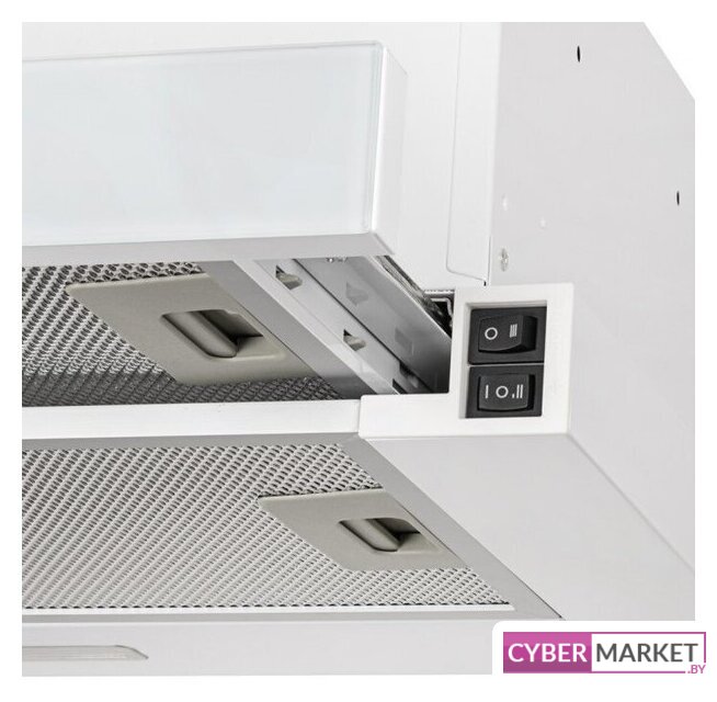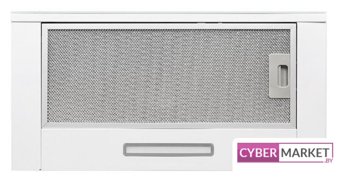 конструкция скрытая, монтаж для встраивания, ширина 59.8 см, управление механическое/кнопочное, производительность мотора 850 м³/ч, цвет белый