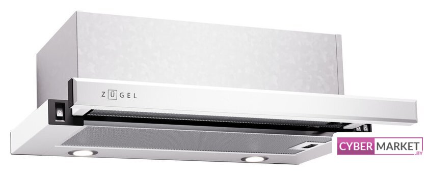 конструкция телескопическая, монтаж для встраивания, ширина 60 см, управление механическое/кнопочное, производительность мотора 600 м³/ч, цвет белый