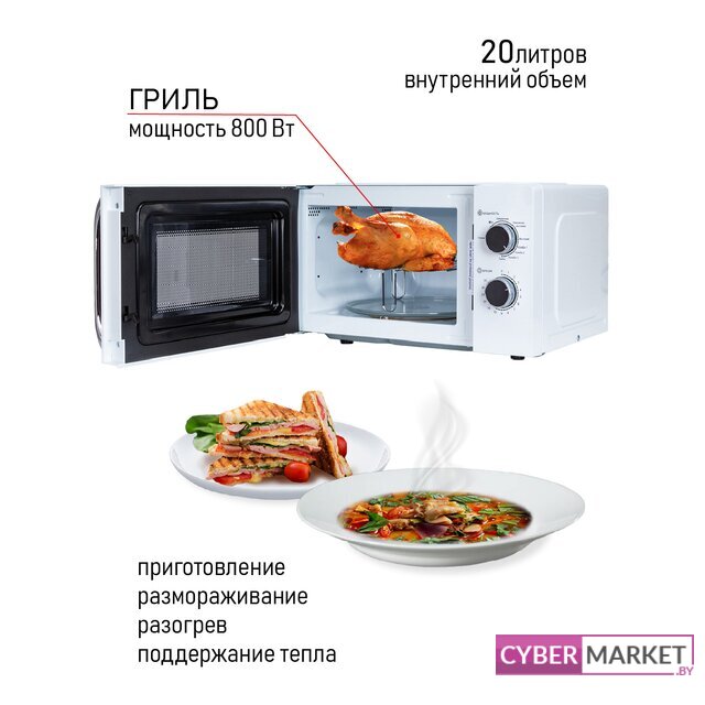 отдельностоящая, микроволны (соло), объем 20 л, выходная мощность микроволн 700 Вт, управление механическое, цвет белый