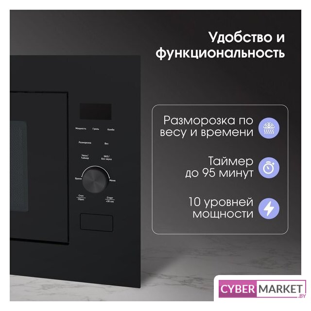 встраиваемая, микроволны и гриль, объем 23 л, выходная мощность микроволн 900 Вт, управление электронное, автоприготовление, авторазмораживание, цвет черный
