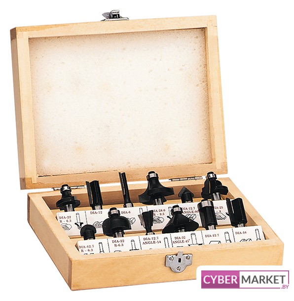 | Комплектация | - Пазовая прямая 12 мм – 1 шт.- Пазовая прямая 6 мм – 1 шт.- Пазовая прямая 16 мм – 1 шт.- Кромочная прямая 12.7 мм – 1 шт.- Пазовая галтельная 12.7 мм, R6.3 мм – 1 шт.- Пазовая галтельная V-образная 90 градусов, 12.7 мм – 1 шт.- Ласточкин хвост 14 градусов, 12.7 мм – 1 шт.- Кромочная конусная 45 градусов, 32 мм – 1 шт.- Кромочная калевочная 22 мм, R6.3 мм – 1 шт.- Кромочная калевочная 28.6 мм, R9.5 мм – 1 шт.- Кромочная калевочная 25 мм, R4 мм – 1 шт.- Кромочная калевочная 22 мм, R6.3 мм – 1 шт. |