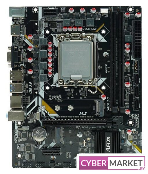 mATX, чипсет Intel H610, память 2xDDR4 до 3200 МГц, слоты: 1xPCIe x16 4.0, 1xPCIe x1, 1xM.2, 3+1+1 фаз питания