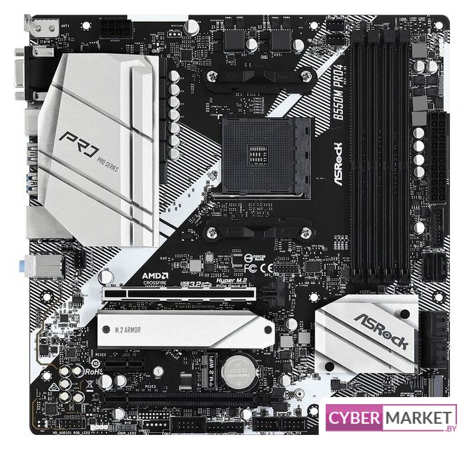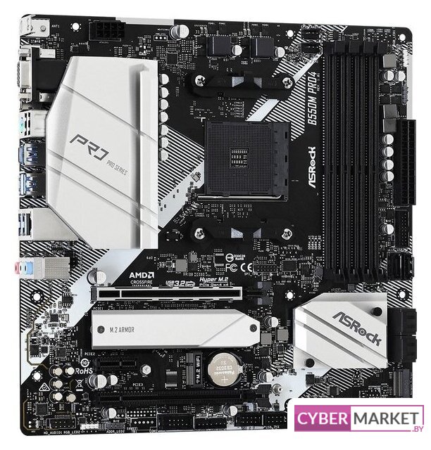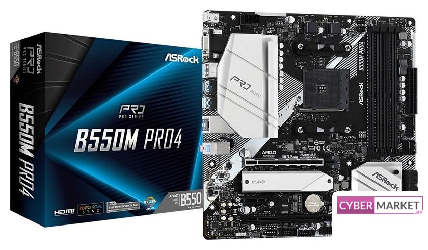 mATX, сокет AMD AM4, чипсет AMD B550, память 4xDDR4 до 4400 МГц, слоты: 1xPCIe x16 4.0 и 3.0, 2xPCIe x1, 2xM.2