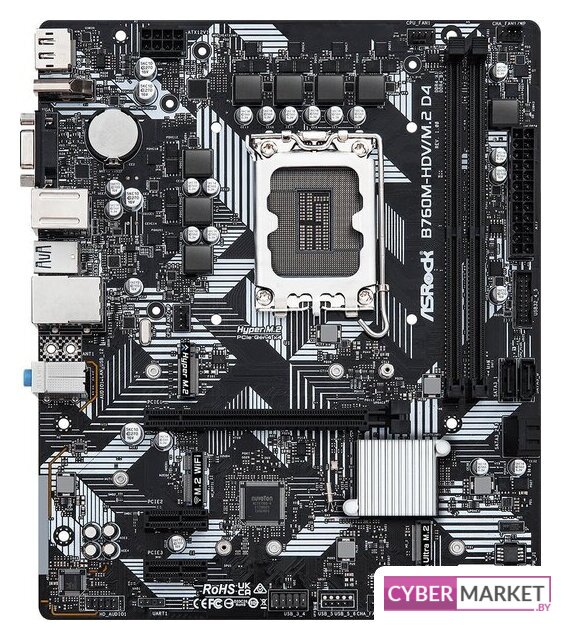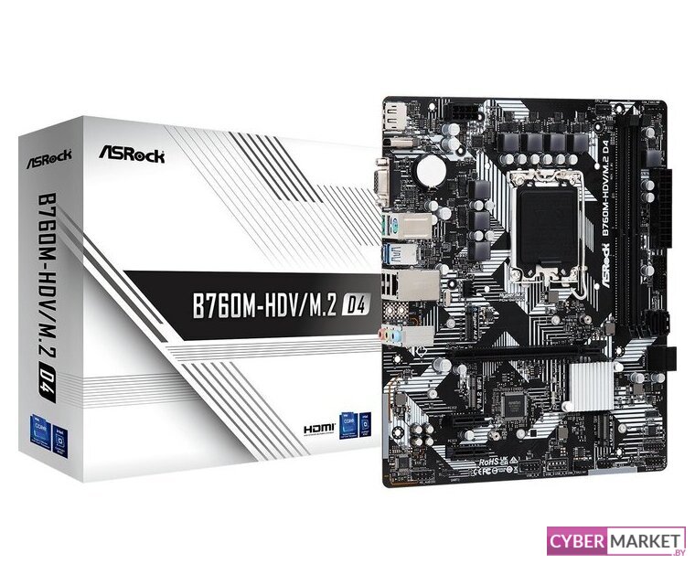 mATX, сокет Intel LGA1700, чипсет Intel B760, память 4xDDR4 до 4800 МГц, слоты: 1xPCIe x16 4.0, 2xPCIe x1, 2xM.2