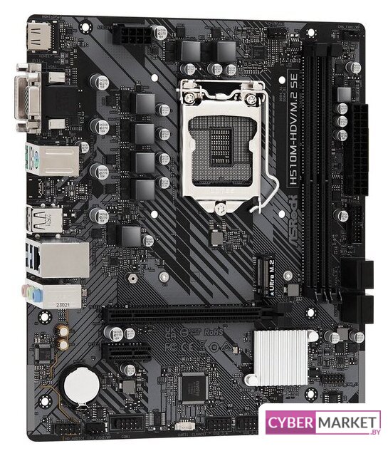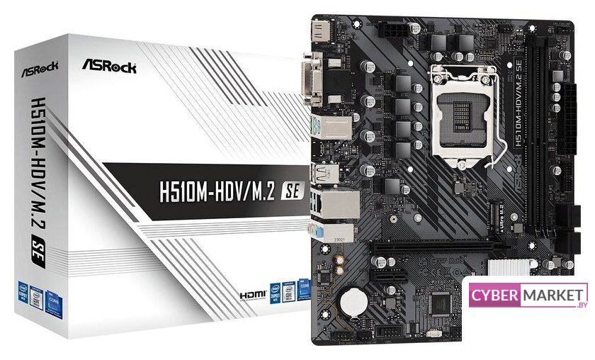 mATX, сокет Intel LGA1200, чипсет Intel H510, память 2xDDR4 до 3200 МГц, слоты: 1xPCIe x16 4.0, 1xPCIe x1, 1xM.2