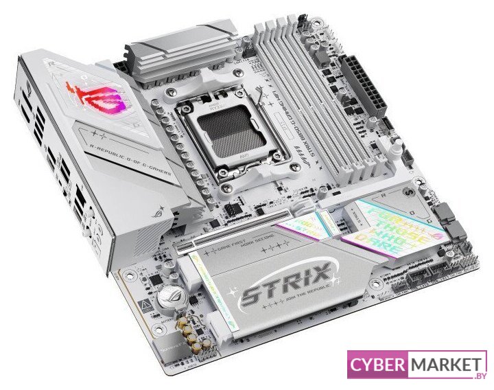mATX, сокет AMD AM5, чипсет AMD B650, память 4xDDR5 до 8000 МГц, слоты: 2xPCIe x16 4.0, 2xM.2, 802.11ax (Wi-Fi 6E)+Bluetooth 5.2, 12+2+1 фаз питания