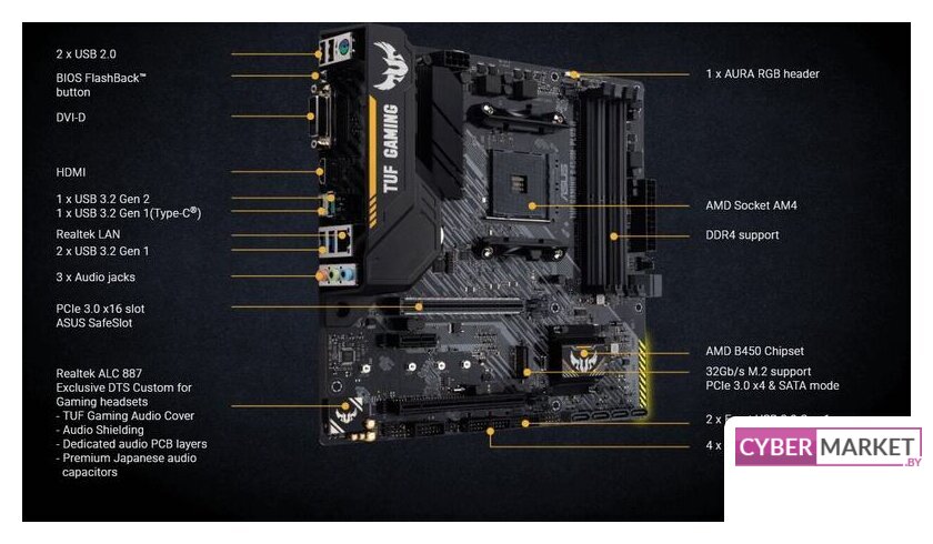ATX, сокет AMD AM4, чипсет AMD B450, память 4xDDR4 до 4400 МГц, слоты: 2xPCIe x16 3.0 и 2.0, 3xPCIe x1, 2xM.2