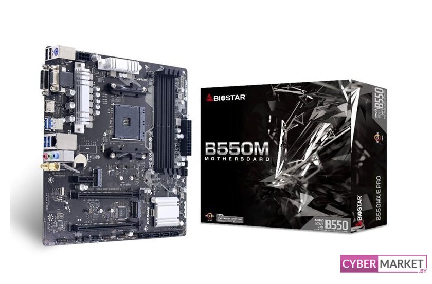 mATX, сокет AMD AM4, чипсет AMD B550, память 2xDDR4 до 4733 МГц, слоты: 1xPCIe x16 4.0, 1xPCIe x1, 1xM.2