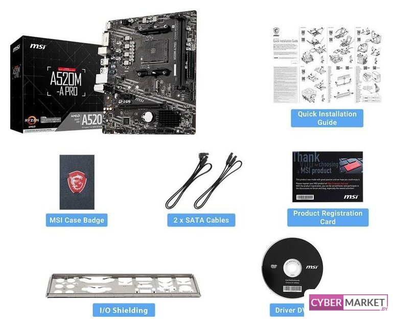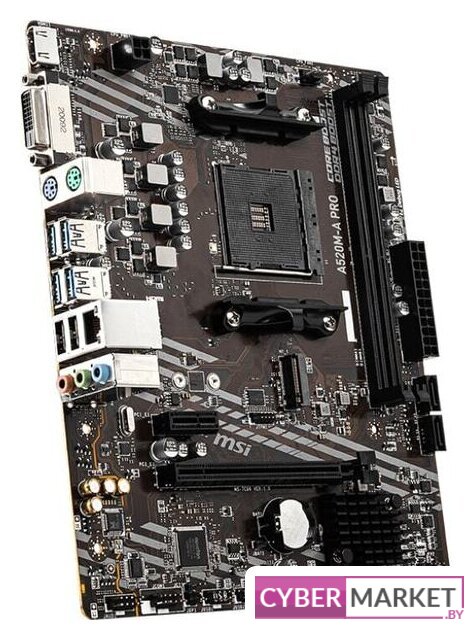 mATX, сокет AMD AM4, чипсет AMD A520, память 2xDDR4 до 4600 МГц, слоты: 1xPCIe x16 3.0, 1xPCIe x1, 1xM.2