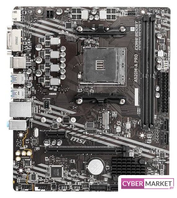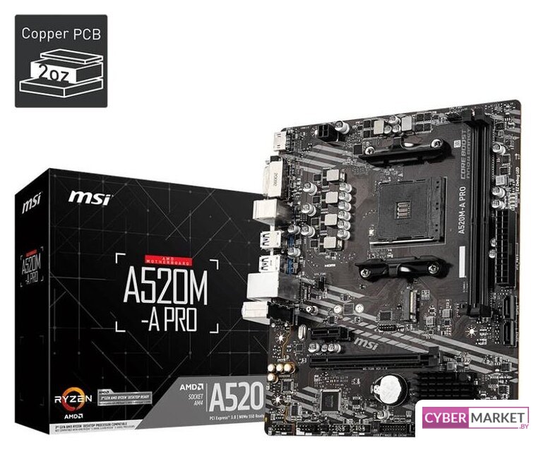 mATX, сокет AMD AM4, чипсет AMD A520, память 2xDDR4, слоты: 1xPCIe x16, 2xPCIe x1, 1xM.2
