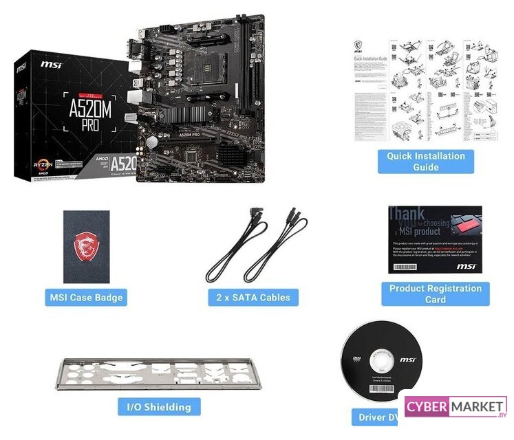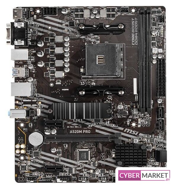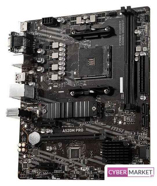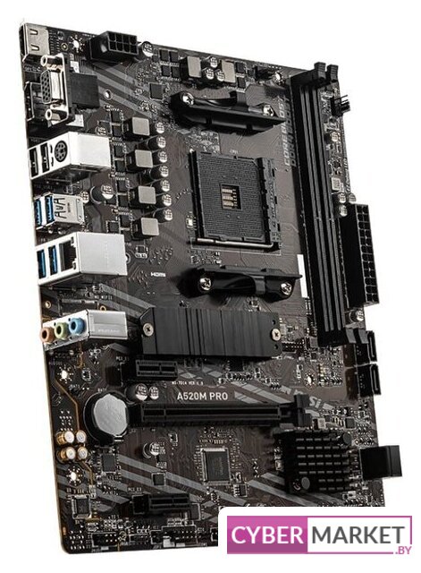 mATX, сокет AMD AM4, чипсет AMD A520, память 2xDDR4 до 4600 МГц, слоты: 1xPCIe x16 3.0, 1xPCIe x1, 1xM.2