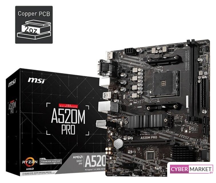 mATX, сокет AMD AM4, чипсет AMD A520, память 2xDDR4, слоты: 1xPCIe x16, 2xPCIe x1, 1xM.2