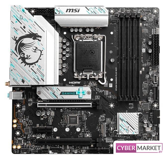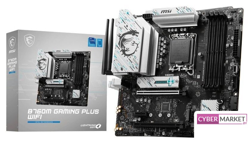 mATX, сокет Intel LGA1700, чипсет Intel B760, память 4xDDR4 до 5333 МГц, слоты: 2xPCIe x16 4.0, 1xPCIe x1, 2xM.2, 802.11ax (Wi-Fi 6E)+Bluetooth 5.3, 12+1 фаз питания