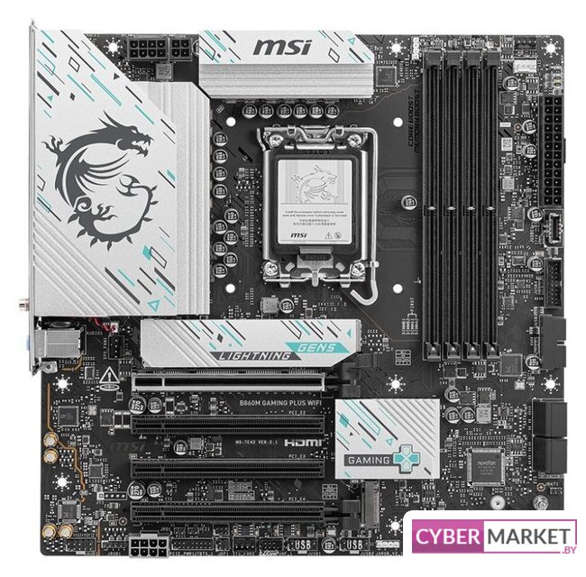 mATX, сокет Intel LGA1851, чипсет Intel B860, память 4xDDR5 до 9200 МГц, слоты: 2xPCIe x16 5.0, 3xM.2, 802.11ax (Wi-Fi 6E)+Bluetooth 5.3, 12+1+2 фаз питания