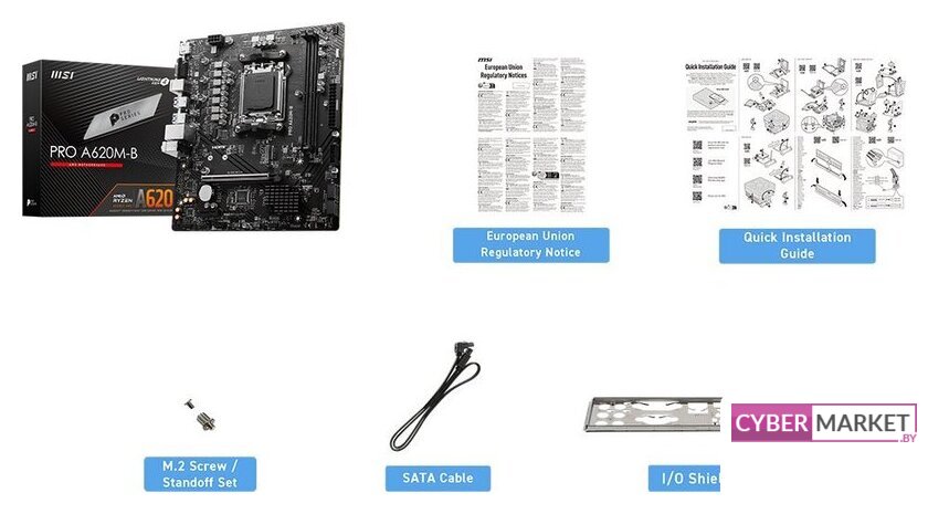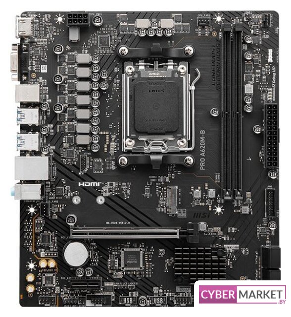mATX, сокет AMD AM5, чипсет AMD A620, память 4xDDR5 до 7600 МГц, слоты: 1xPCIe x16 4.0, 1xPCIe x1, 1xM.2, 5+2+2 фаз питания