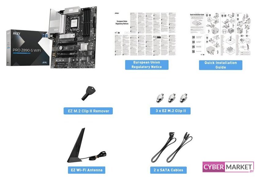 | Комплектация | - EZ Wi-Fi антенна - 2 кабеля SATA- ключ-экстрактор EZ M.2 Clip II - 3 винта со стойкой EZ M.2 Clip II- документация |