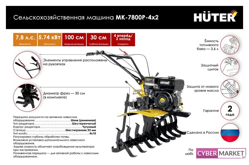 мотоблок, двигатель бензиновый четырехтактный 7.8 л.с. 5736 Вт