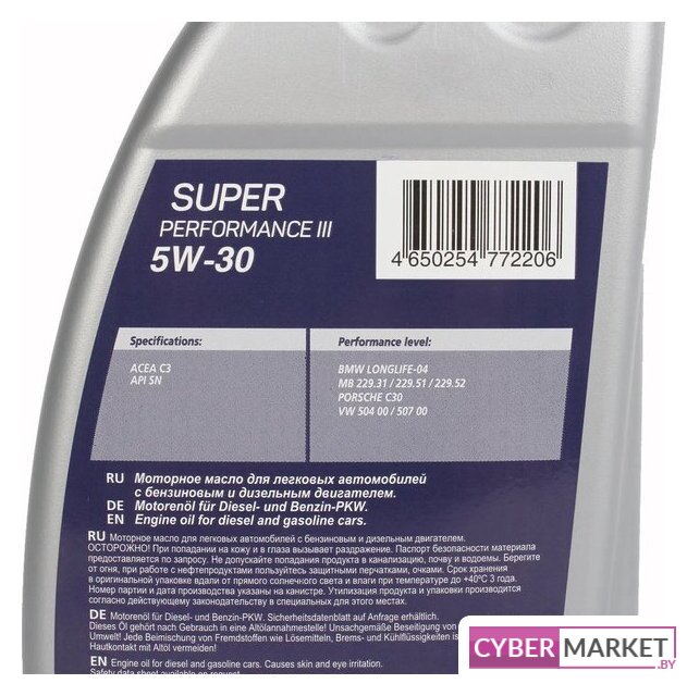 | Допуски и спецификации для легковых авто | ACEA C3, BMW Longlife-04, MB 229.31, MB 229.51, MB 229.52, Porsche C30, VW 504 00, VW 507 00 |