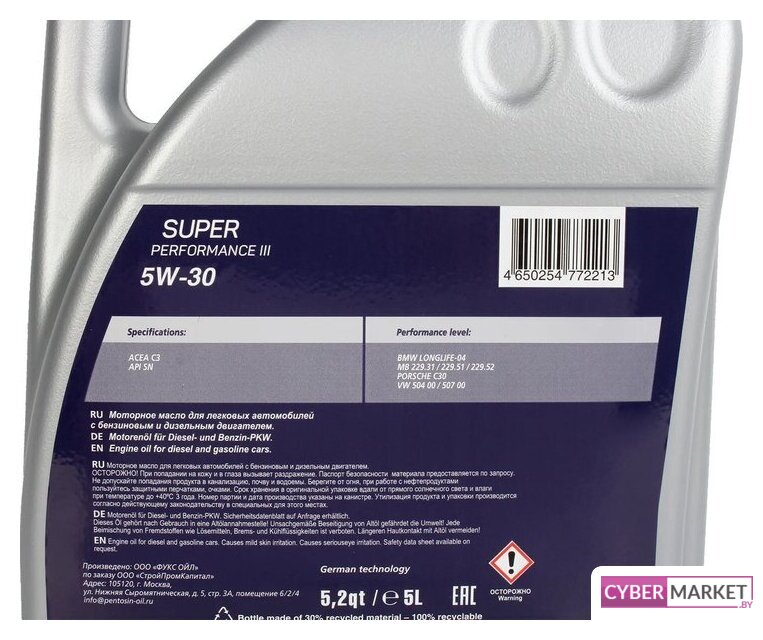 | Допуски и спецификации для легковых авто | ACEA C3, BMW Longlife-04, MB 229.31, MB 229.51, MB 229.52, Porsche C30, VW 504 00, VW 507 00 |