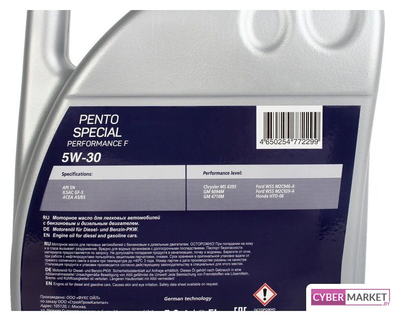 | Допуски и спецификации для легковых авто | ACEA A5/B5, Chrysler MS-6395, Ford WSS-M2C913-A, Ford WSS-M2C913-B, Ford WSS-M2C913-C, Ford WSS-M2C929-A, Ford WSS-M2C946-A, GM 4718 M, GM 6094 M, ILSAC GF-5 |