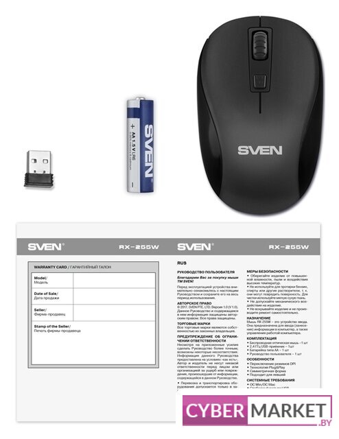 | Комплектация | - мышь;- USB-приемник;- батарейка типа АА;- документация. |
