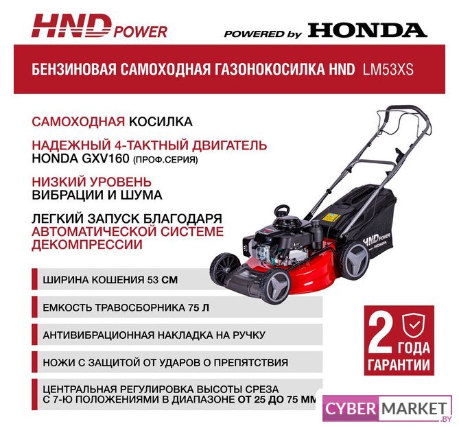 роторная газонокосилка, самоходная, бензиновый двигатель, 5500 Вт, 7.5 л.с., четырехтактный, ширина скашивания: 53 см 75 л
