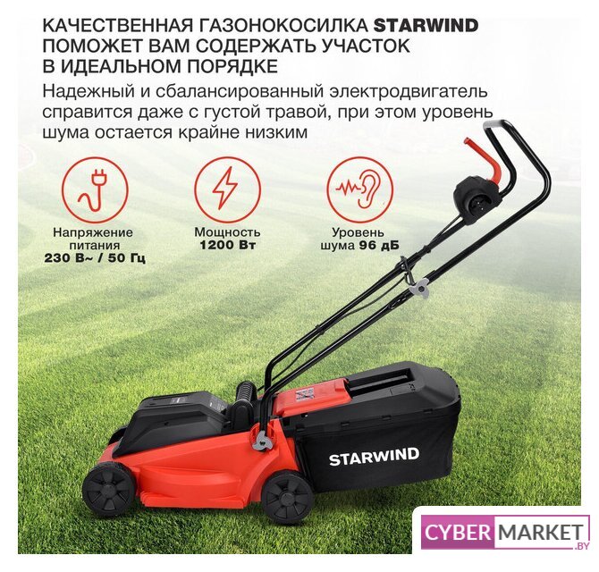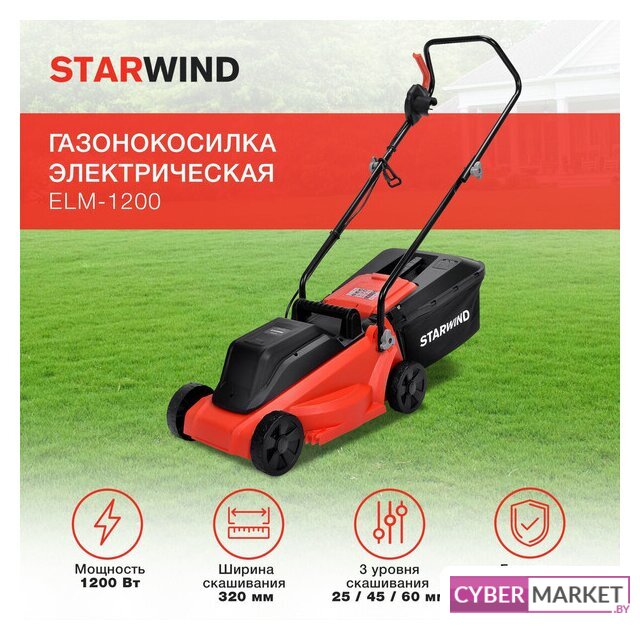 роторная газонокосилка, электрический двигатель, 1200 Вт, 1.6 л.с., ширина скашивания: 32 см, жесткий травосборник 28 л